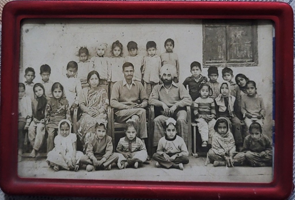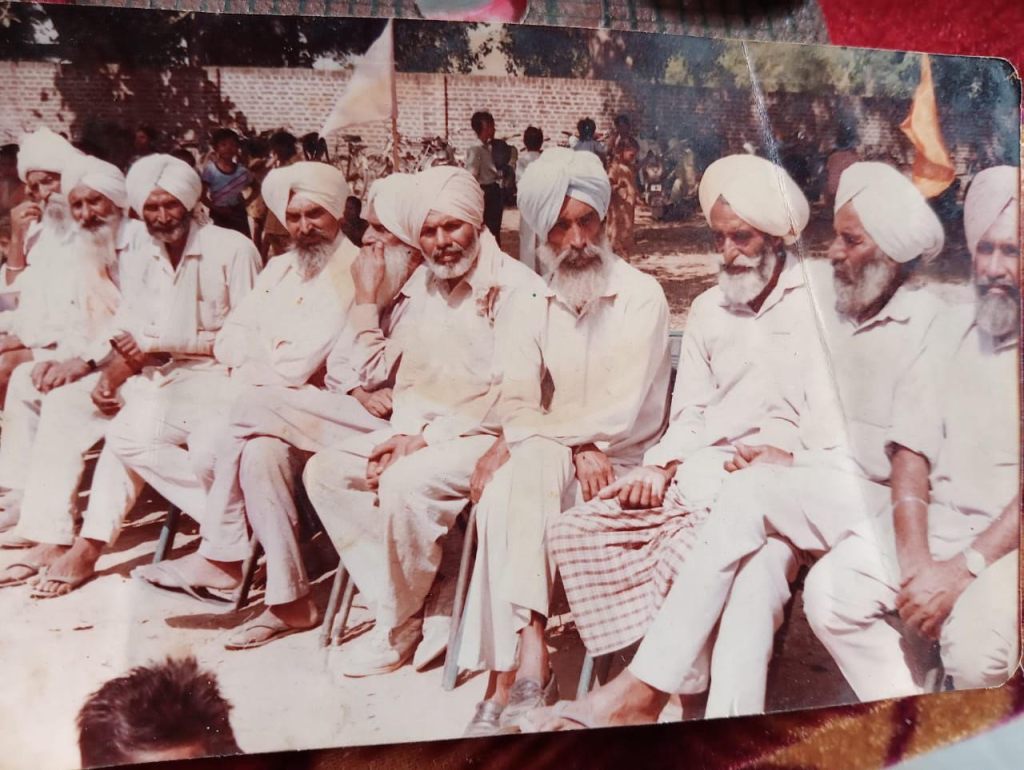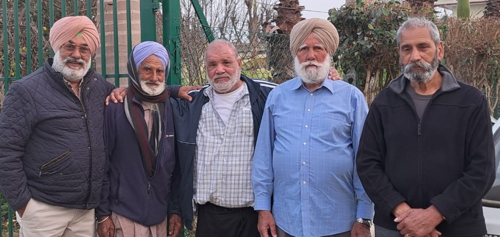 (ਖੱਬਿਓਂ ਸੱਜੇ) Nirmal Singh Bains, Kuldip Singh Bains, Mohinder Singh Bains, Jagir Singh Bains. Pohli Lakha, Ajaib Singh Bains and Debi Shadi Puria. Right to left: Jagtar Singh Sandhu, Harwinder Singh Sandhu, Sukhdev Singh ‘Kala’, Santosh Singh, Mangal Singh (Pic credit Malkiat Singh Sandhu)