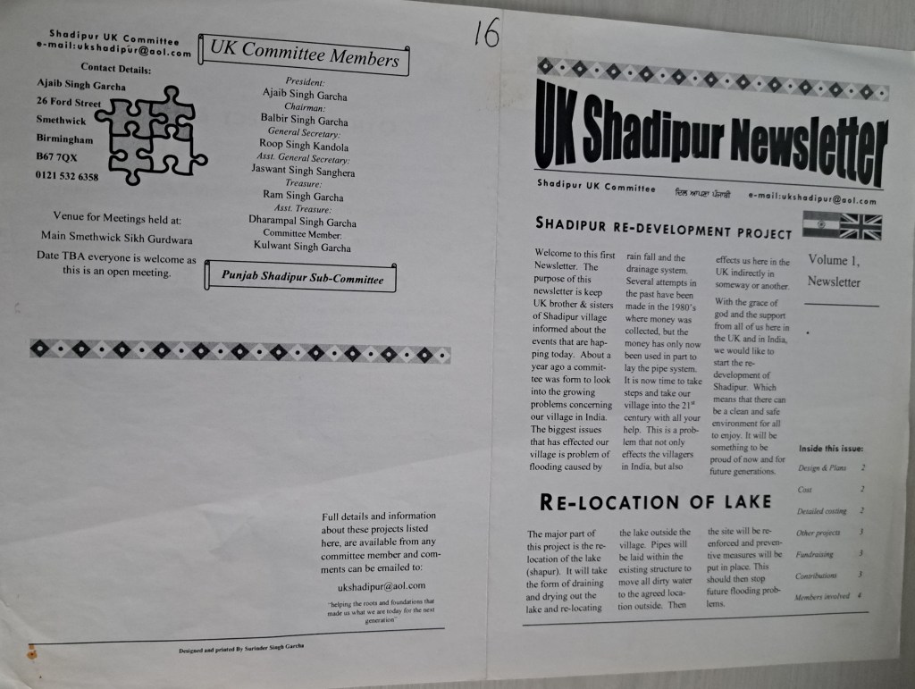 ਦੇਸ਼ਾ-ਵਿਦੇਸ਼ਾ ਵਿੱਚ ਵਸਦੇ ਪਿੰਡ ਸ਼ਾਦੀ ਪੁਰ ਦੇ ਨਿਵਾਸੀਓ ਸੁਰਿੰਦਰ ਸਿੰਘ ਗਰਚਾ UK ਵਲੋਂ design ਕੀਤਾ ਗਿਆ ਇਹ “UK ShadiPur Newsletter ” ਜੋ ਕੇ ਸ਼ਾਦੀਪੁਰ ਦੀ ਰੀ -ਡਿਵੈਲਪਮੈਂਟ ਪ੍ਰੋਜੈਕਟ ਬਾਰੇ ਸੀ, ਸਭ ਕਮੇਟੀ members ਦੇ ਉਪਰਾਲੇ ਨੂੰ ਬਿਆਨ ਕਰਦਾ ਹੈ ਕਿ ਕਿਵੇਂ ਵਿਦੇਸ਼ਾ (UK) ਵਿੱਚ ਬੈਠੇ ਪੰਜਾਬੀ ਆਪਣੇ ਵਤਨ ਨਾਲ ਪਿਆਰ ਦਾ ਇਜ਼ਹਾਰ ਗੱਲਾਂਬਾਤਾਂ ਨਾਲ ਨਹੀਂ ਸਗੋਂ ਪ੍ਰੈਕਟੀਕਲ ਕਰ ਦੇ ਵਿਖਾਉਂਦੇ ਸਨ ਅਤੇ ਵਿਖਾ ਵੀ ਰਹੇ ਹਨ – ਸਭ ਸਤਿਕਾਰ ਦੇ ਪਾਤਰ ਹਨ.